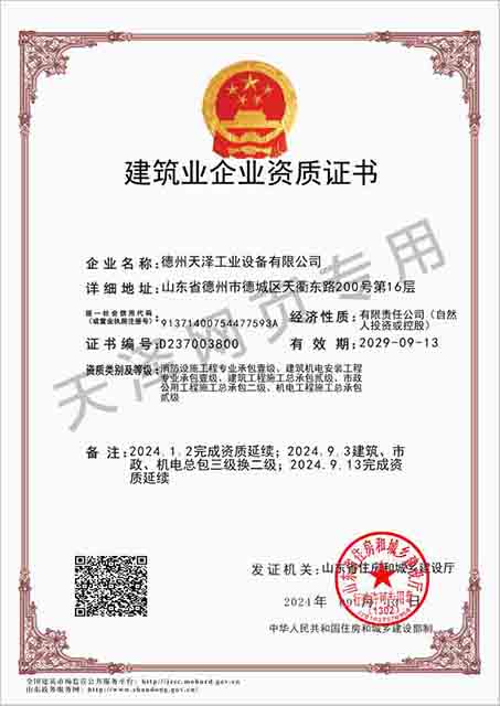 德州天澤工業(yè)設備有限公司成立于2003年(前身為德州天元集團天明工業(yè)設備安裝公司),經(jīng)過20多年的發(fā)展,現(xiàn)成長為擁有職工600余人,各類專業(yè)技術人員近300余人,年生產(chǎn)能力兩億元以上,以建筑機電安裝工程、消防設施安裝工程施工為主,集建筑工程施工、市政工程施工、建筑智能化工程施工、園林綠化工程施工、工程管理服務、物業(yè)管理、電氣機械設備銷售等多元化經(jīng)營于一體的綜合型企業(yè)。2005年,企業(yè)按照國際標準建立的質量管理體系,通過了ISO質量管理體系認證、環(huán)境管理體系認證、職業(yè)健康安全管理體系認證。施工工程遍布山東、河北、四川、江蘇等地,最具代表性的工程有:山東省德州市百腦匯資訊廣場機電安裝工程、德州經(jīng)濟開發(fā)區(qū)天元大廈機電安裝工程、陵城區(qū)人民醫(yī)院機電安裝工程、德州金魯班大廈機電安裝工程、河北故城金辰小區(qū)機電安裝工程、北川地震災后援建工程等。多年來,公司始終堅持“以人為本,建精品工程,創(chuàng)行業(yè)品牌”的經(jīng)營理念,先后榮獲省(市)級泰山杯、天府杯、魯安杯等獎項,申報各種功法、多項專利。